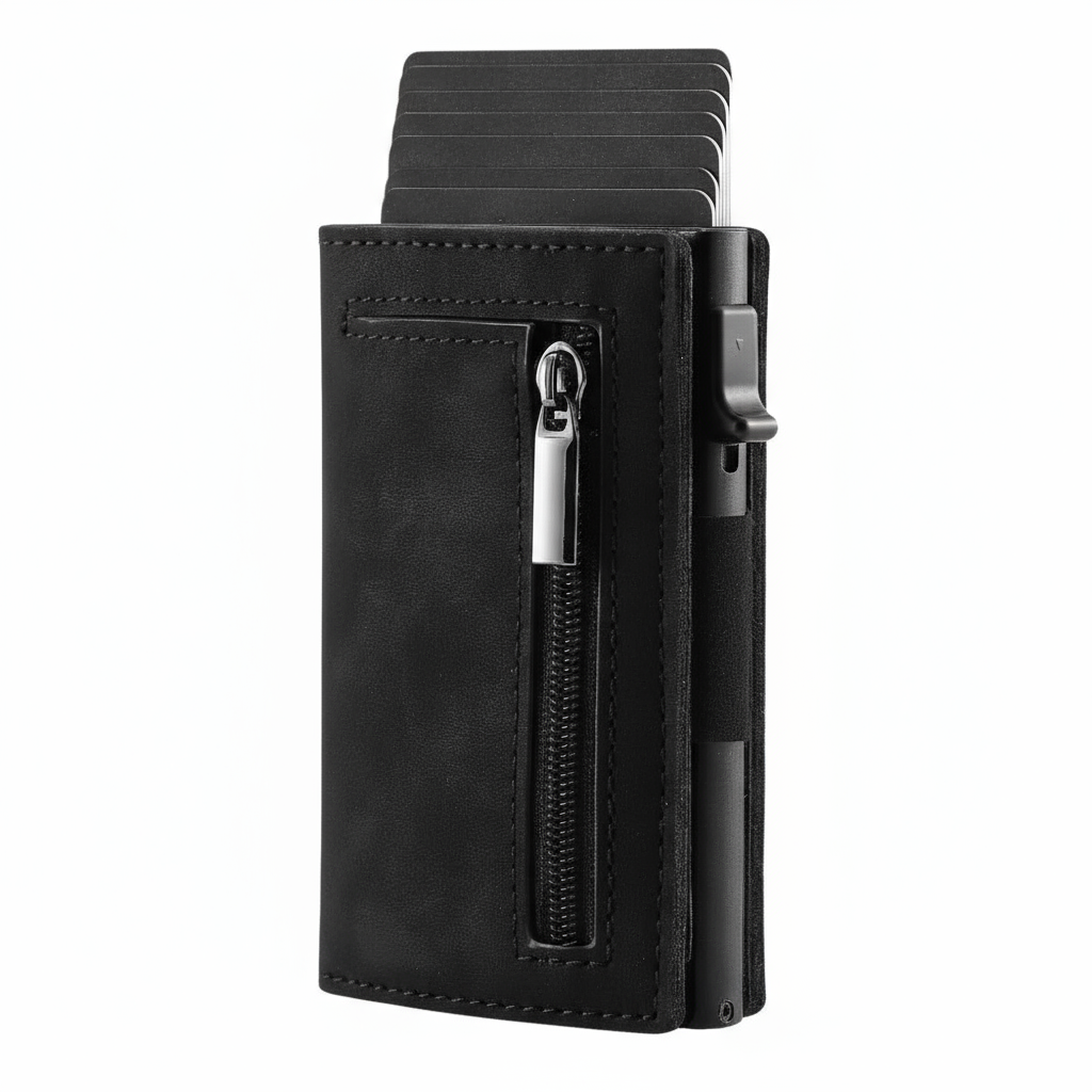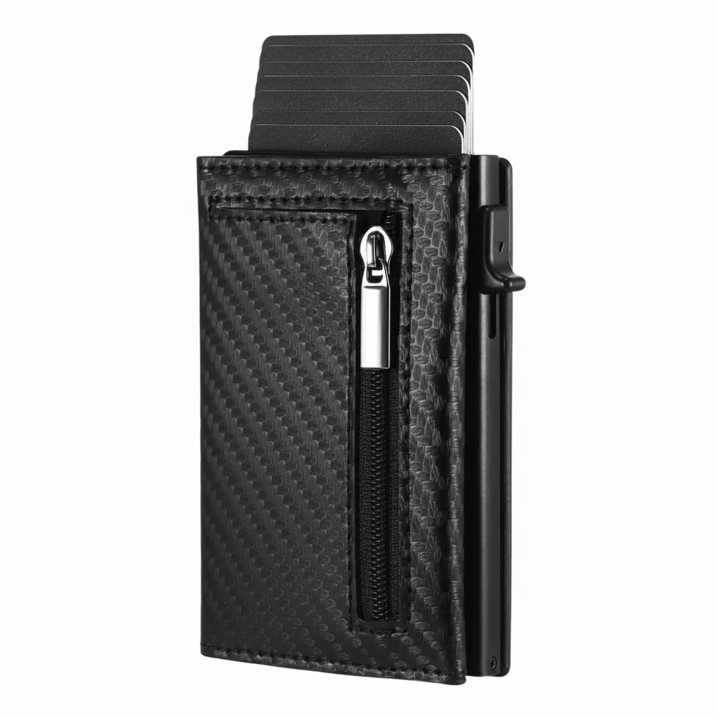 Hasta 11 tarjetas (7 con acceso rápido mediante el mecanismo pop-up + 4 en bolsillos internos), hasta 10 billetes sin doblar y monedas.
