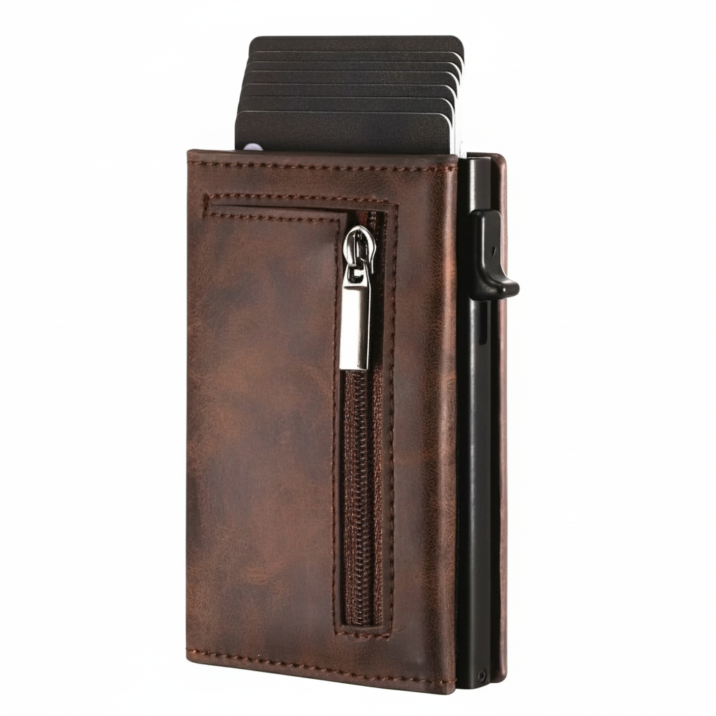 Materiales premium: aluminio con protección RFID, piel de alta calidad y cierre magnético reforzado.